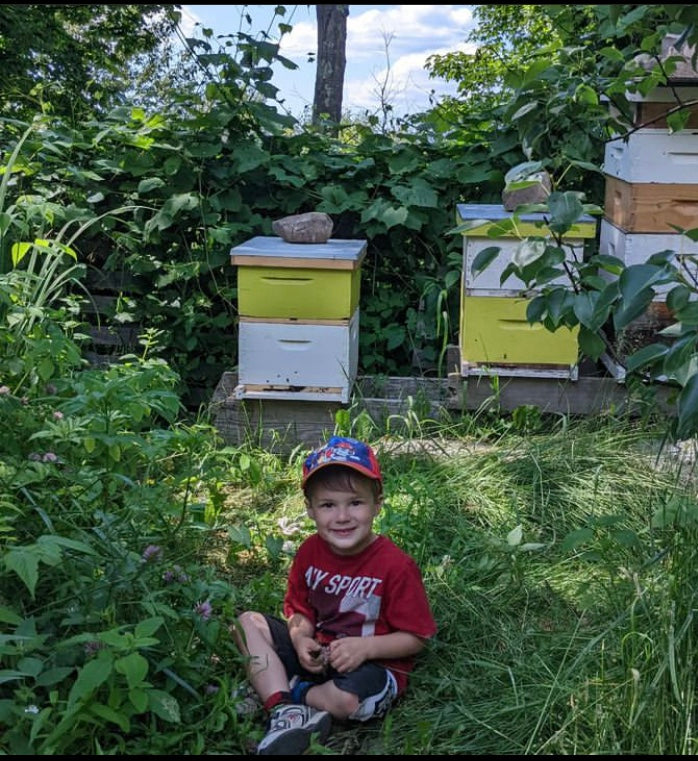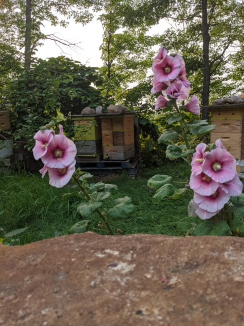 This is Neal's Naturals second bee yard which currently contains five hives. A lovely spot with beautiful flowers and trees, and even a pond.