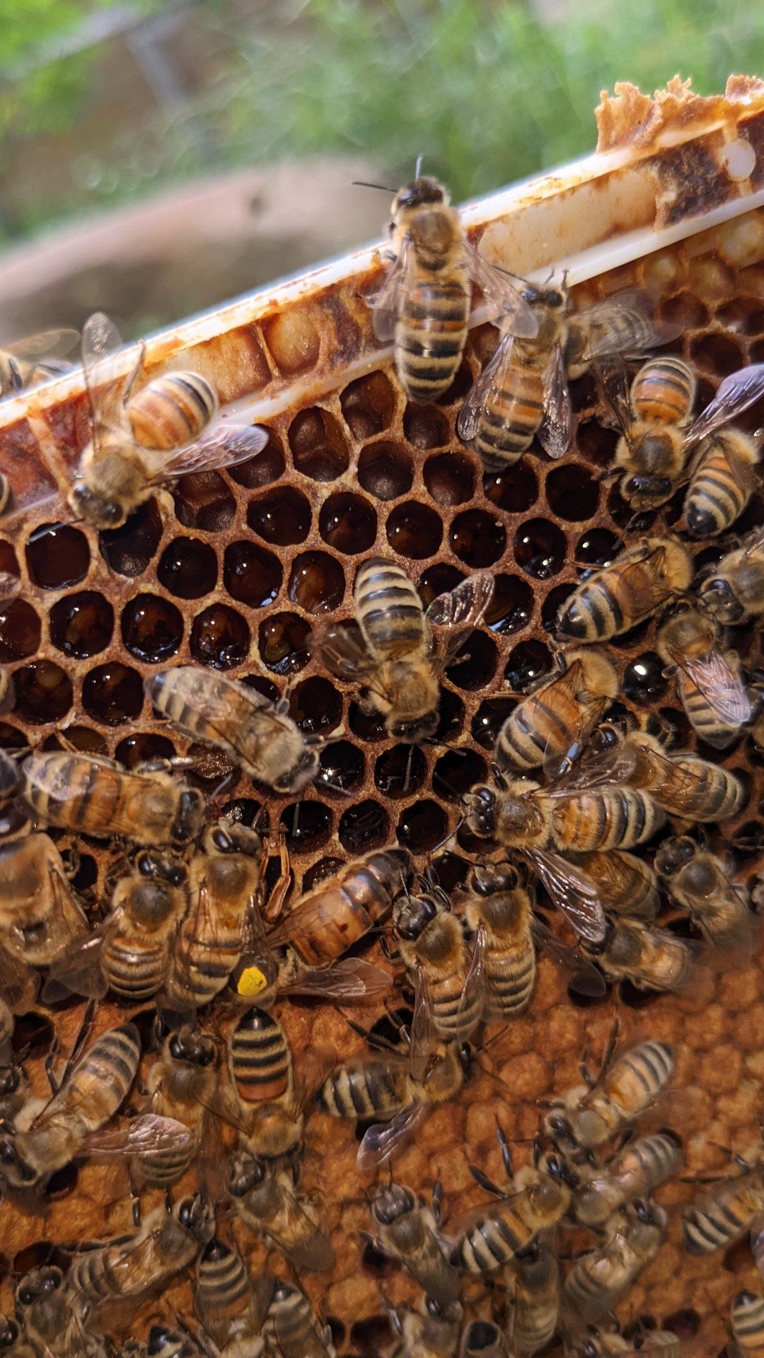 These are some of Neal's Natural bees. Our lines include Buckfast and Carniolan which produce strong and gentle bees. Pictured above you can see one of our queens marked with a yellow dot on her thorax.